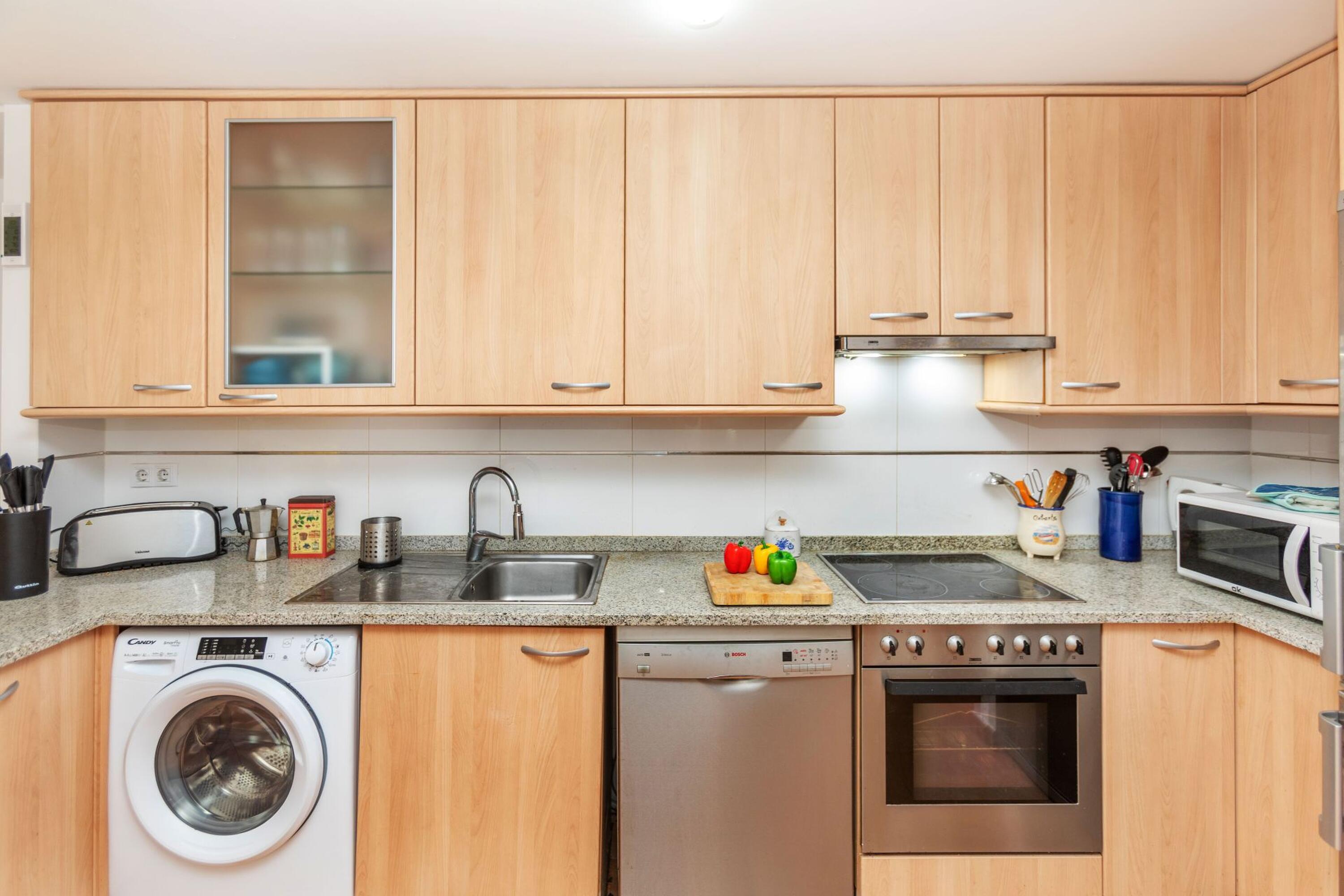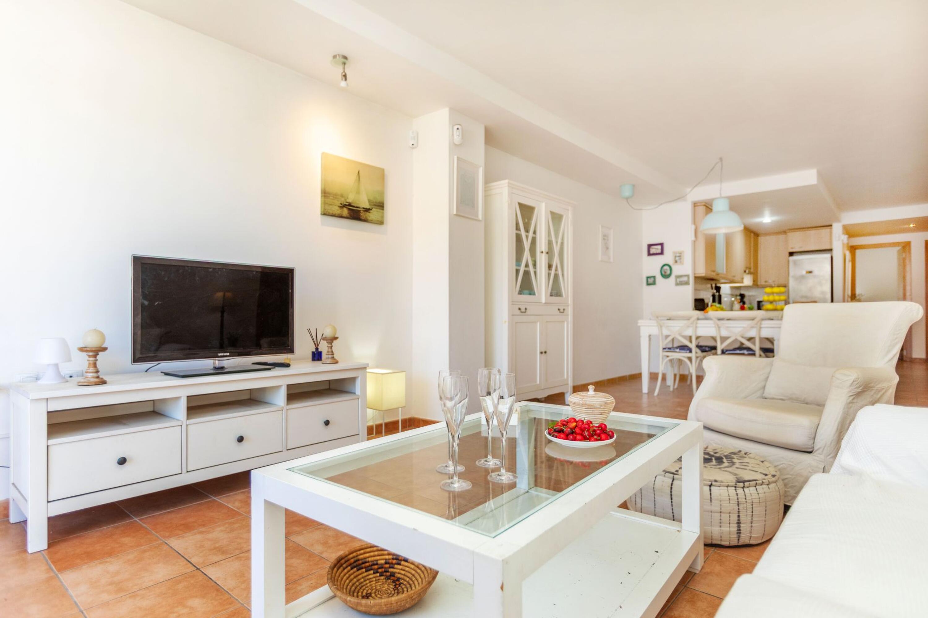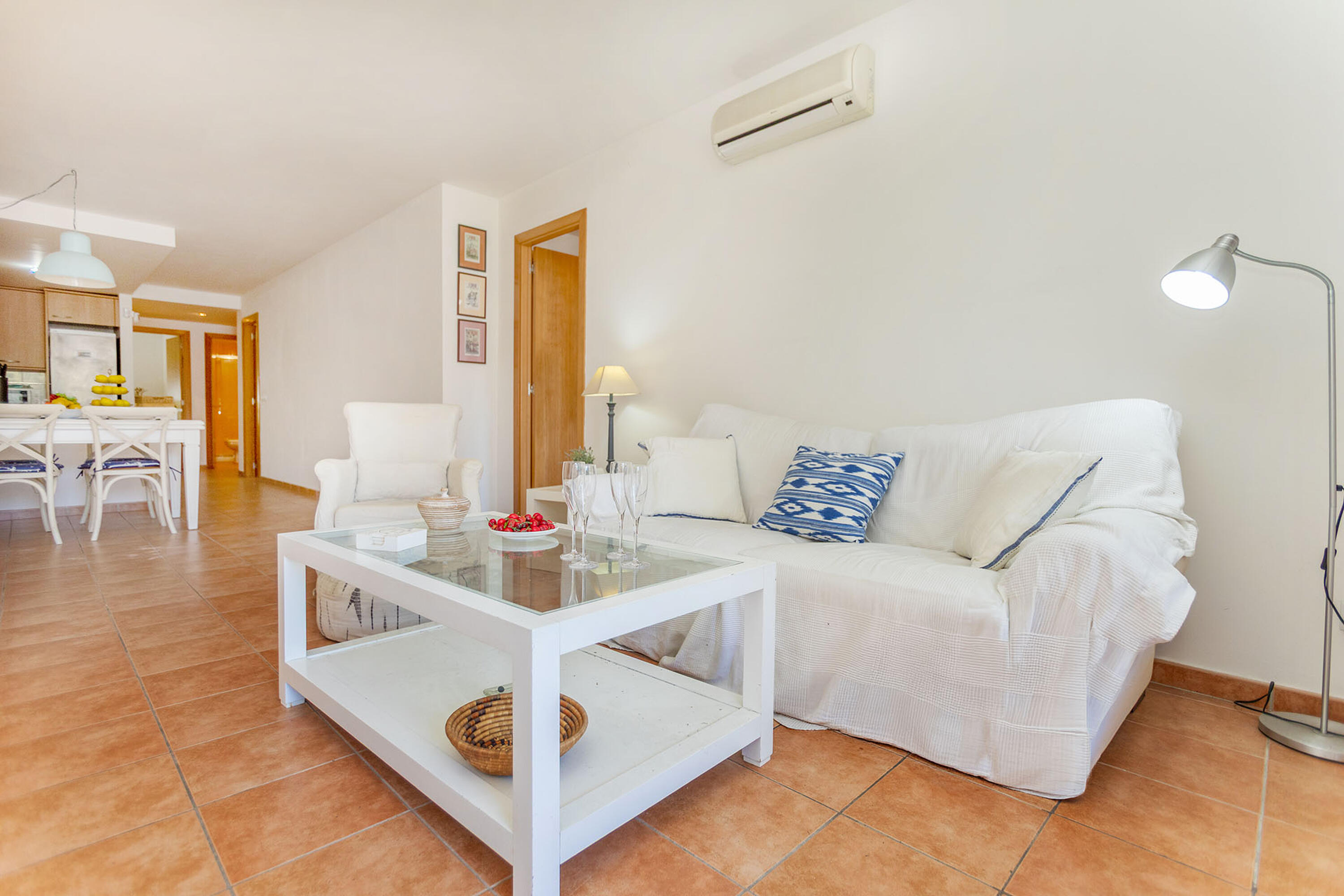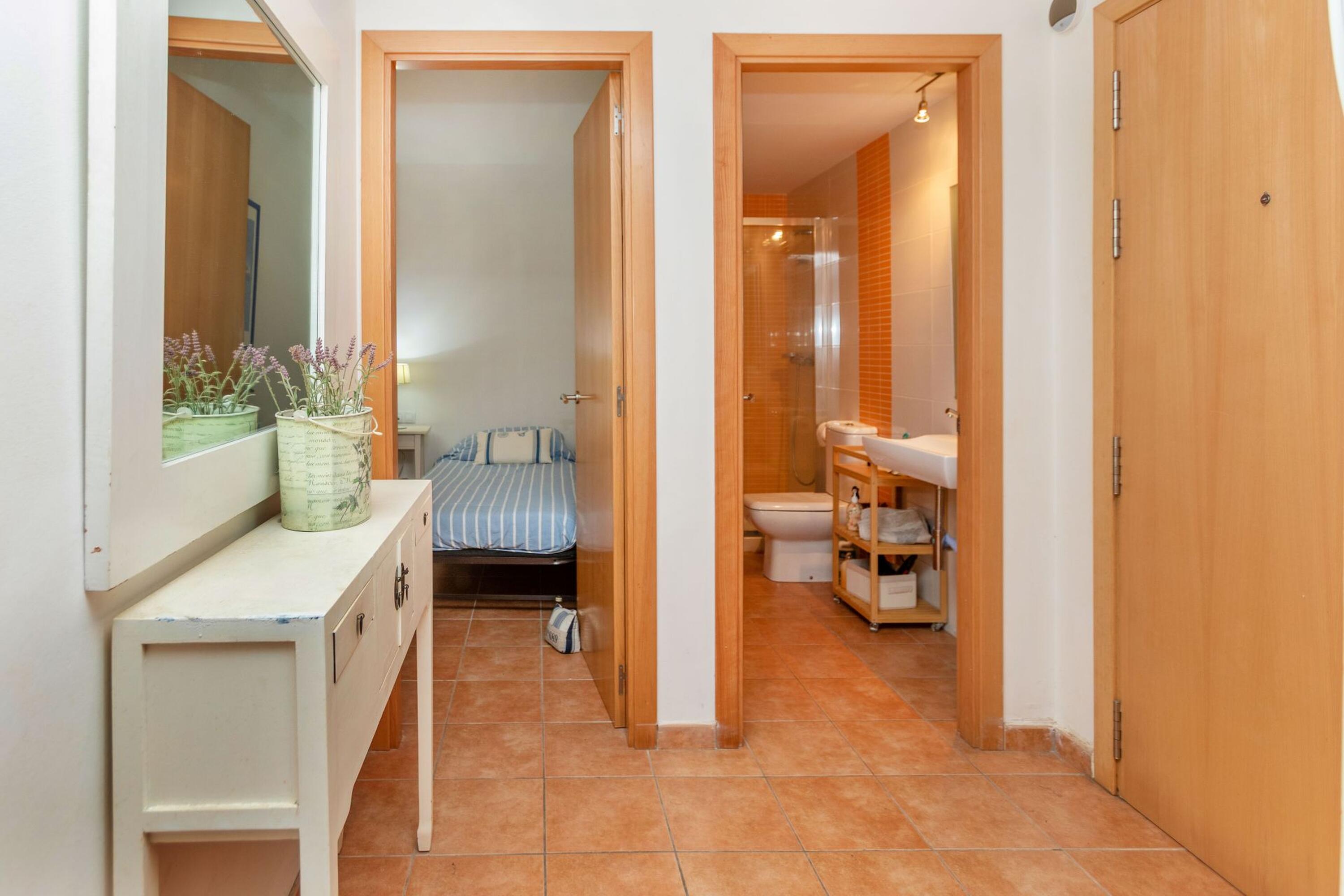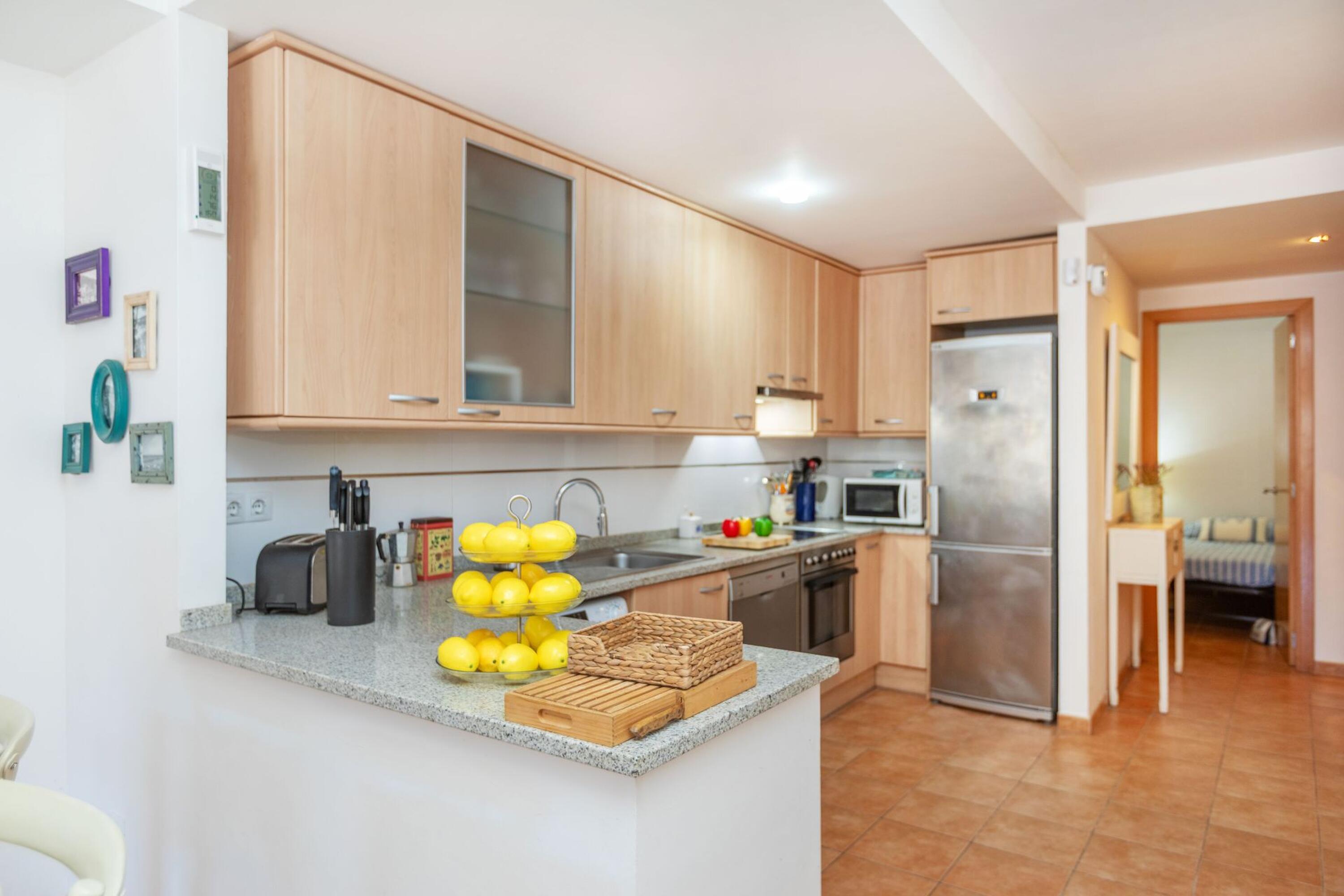 L’apartament té 75 m² i es distribueix en 3 dormitoris: dues habitacions de matrimoni i un dormitori doble. Disposa de 2 banys complets, un amb dutxa i un altre amb banyera. La cuina americana, totalment equipada, inclou rentaplats i s’integra amb el saló-menjador, amb accés directe a una terrassa.
