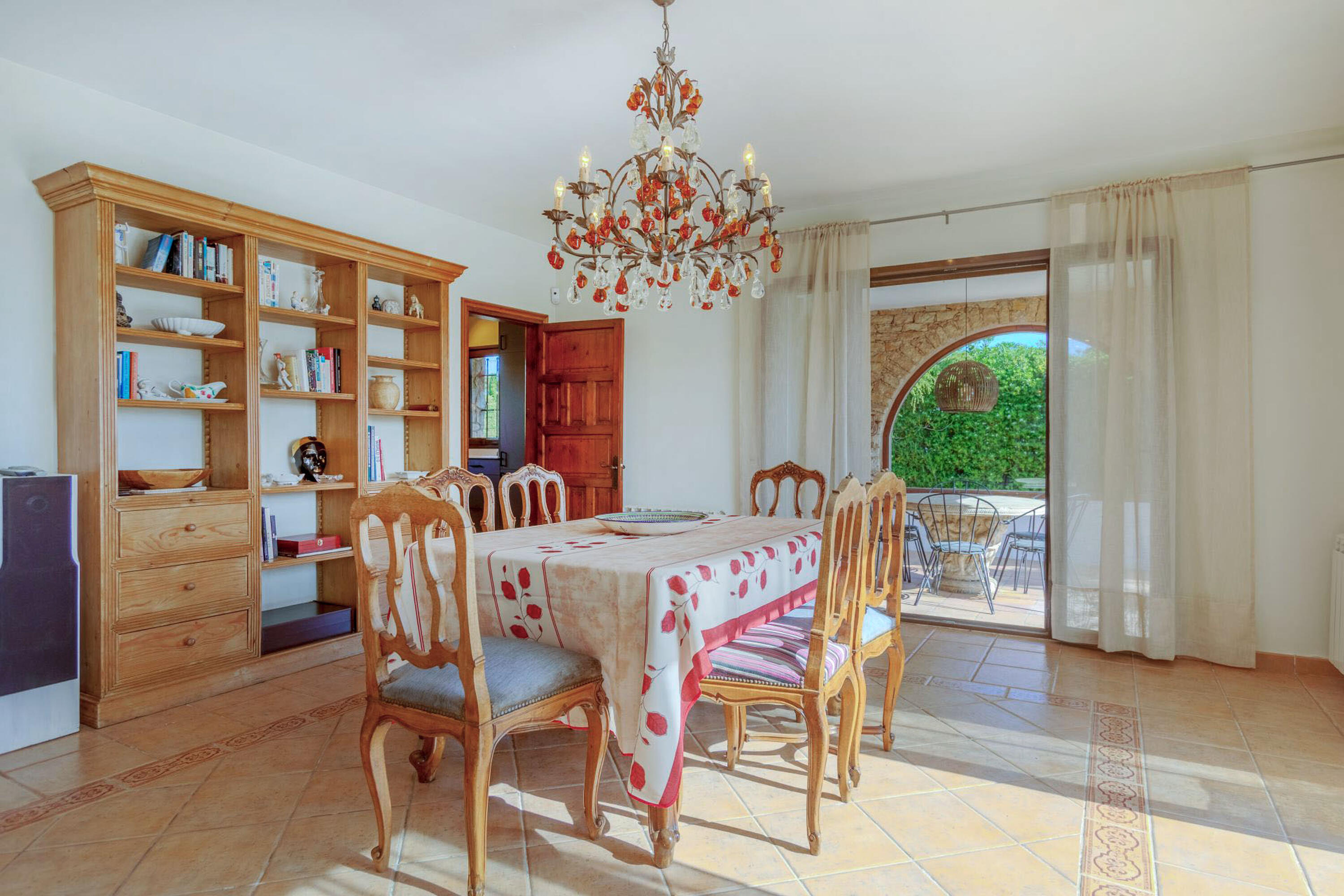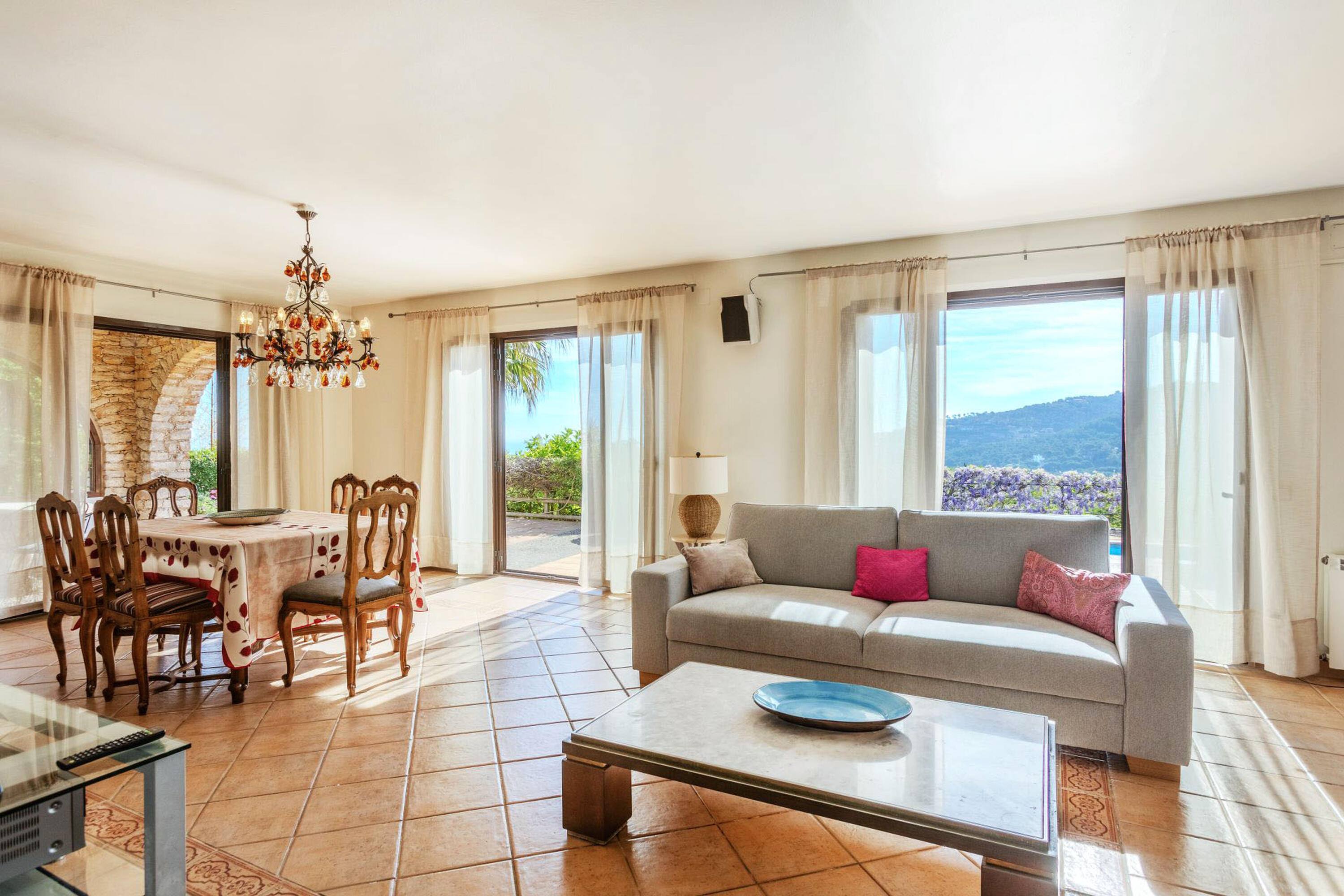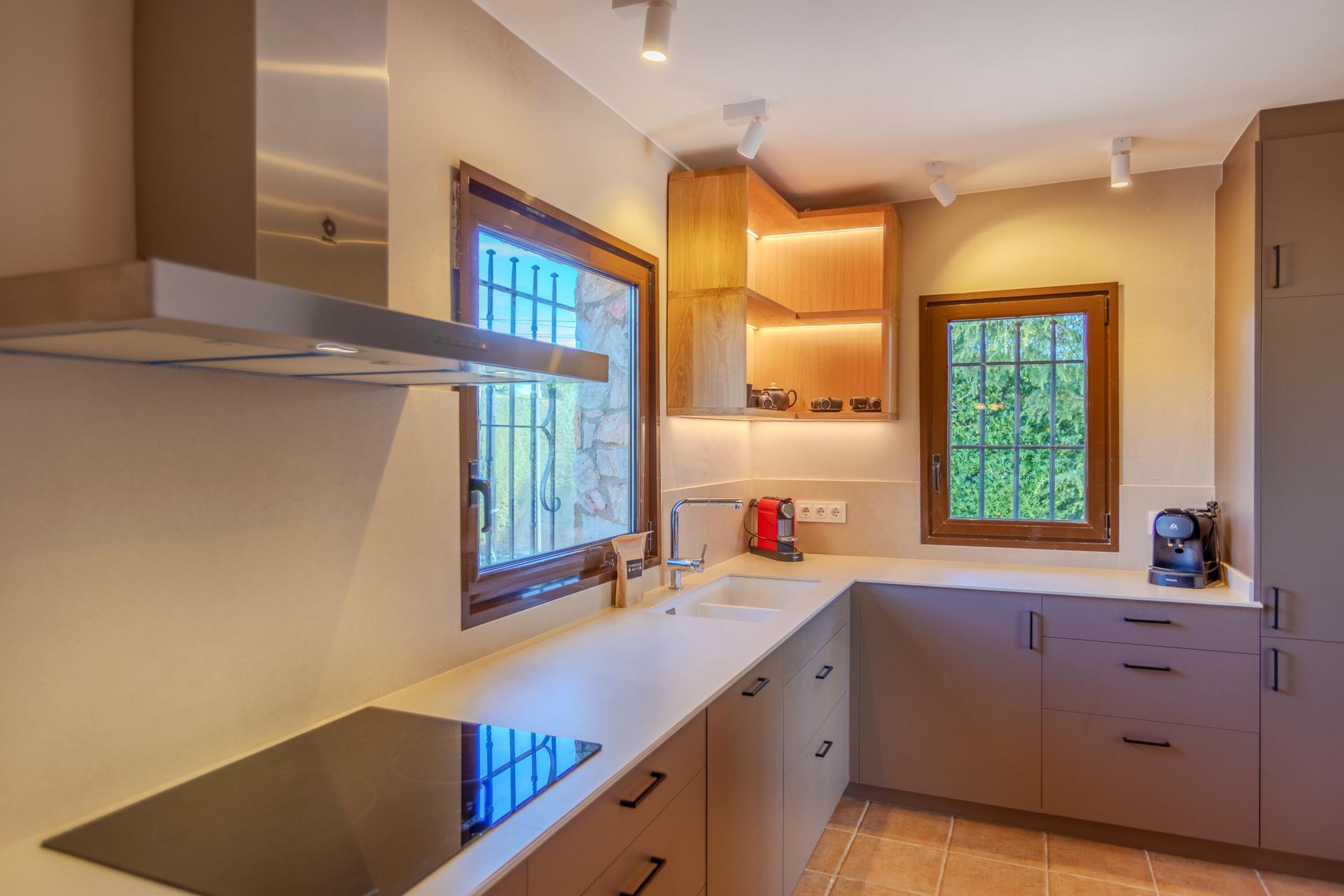 La casa, construïda a un sol nivell i envoltada d'un preciós jardí, té un gran pati de pedra. L’espectacular terrassa, amb coberta de fusta i una idíl·lica piscina amb vista al mar, ens permetrà disfrutar del sol, de la brisa marina i del preciós paisatge mediterrani. Gaudeixi d’aquest petit paradís amb total privacitat! Ampli i assolellat saló menjador amb sortida a la terrassa i vista a la piscina i al mar, des del qual també s’accedeix a la zona de barbacoa i a la bonica cuina totalment equipada.