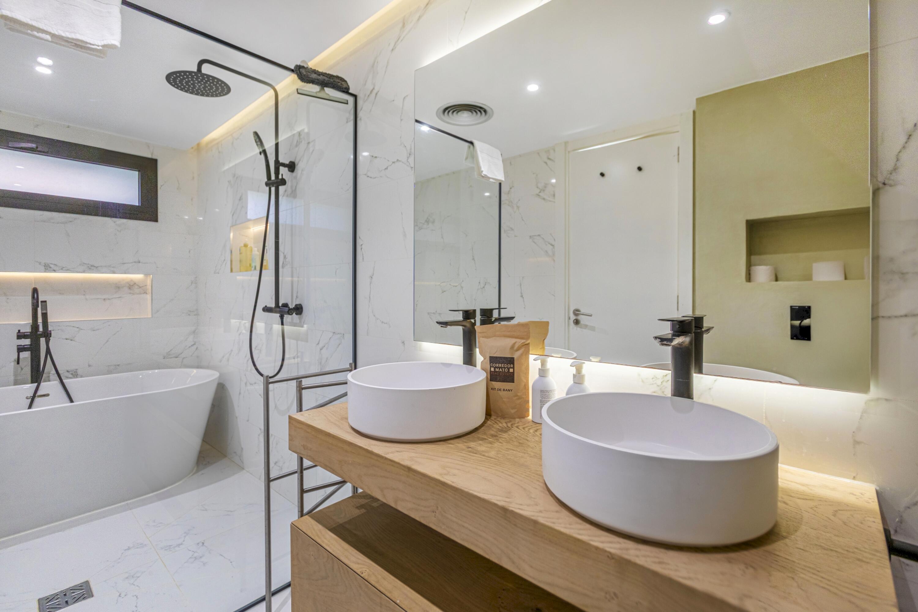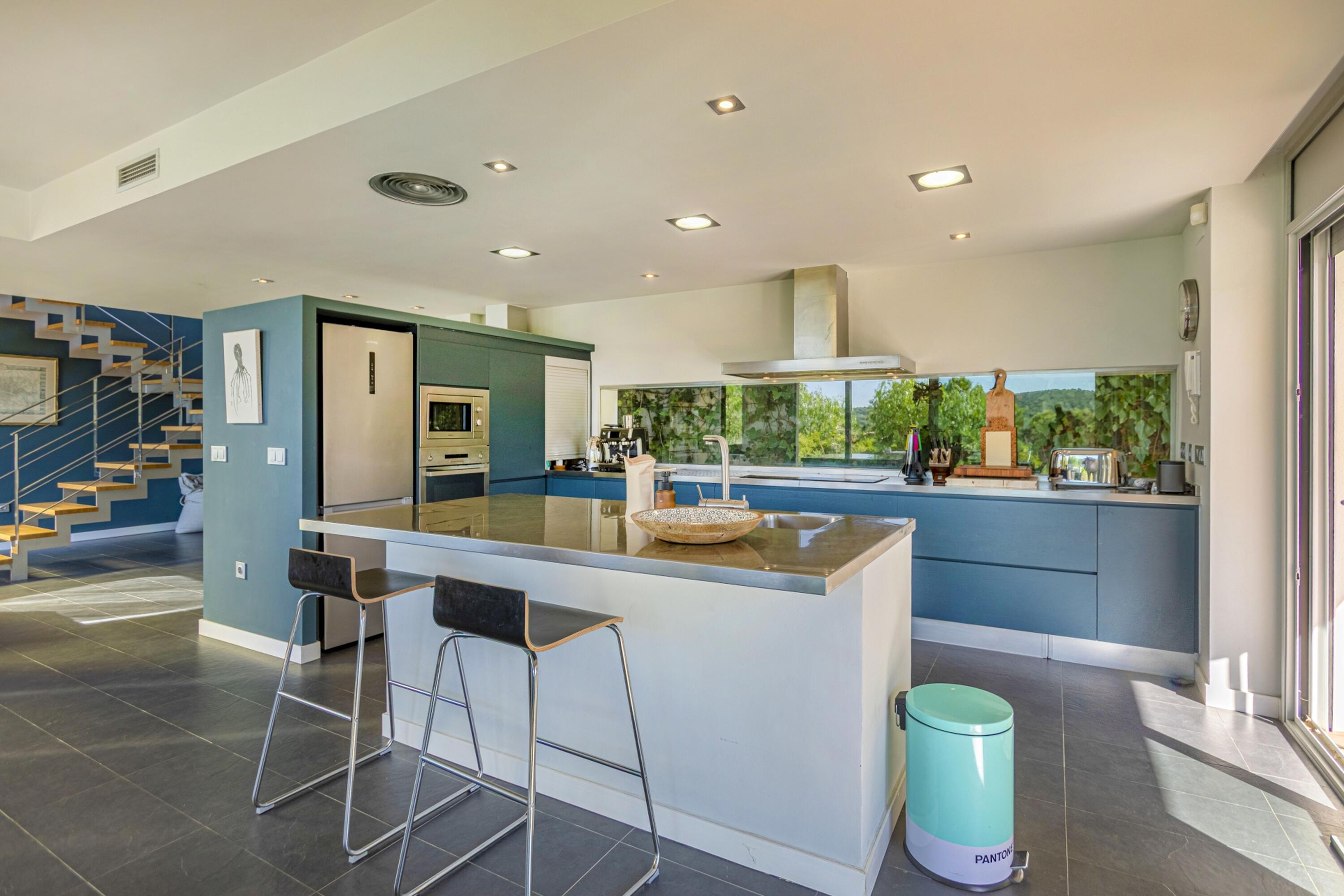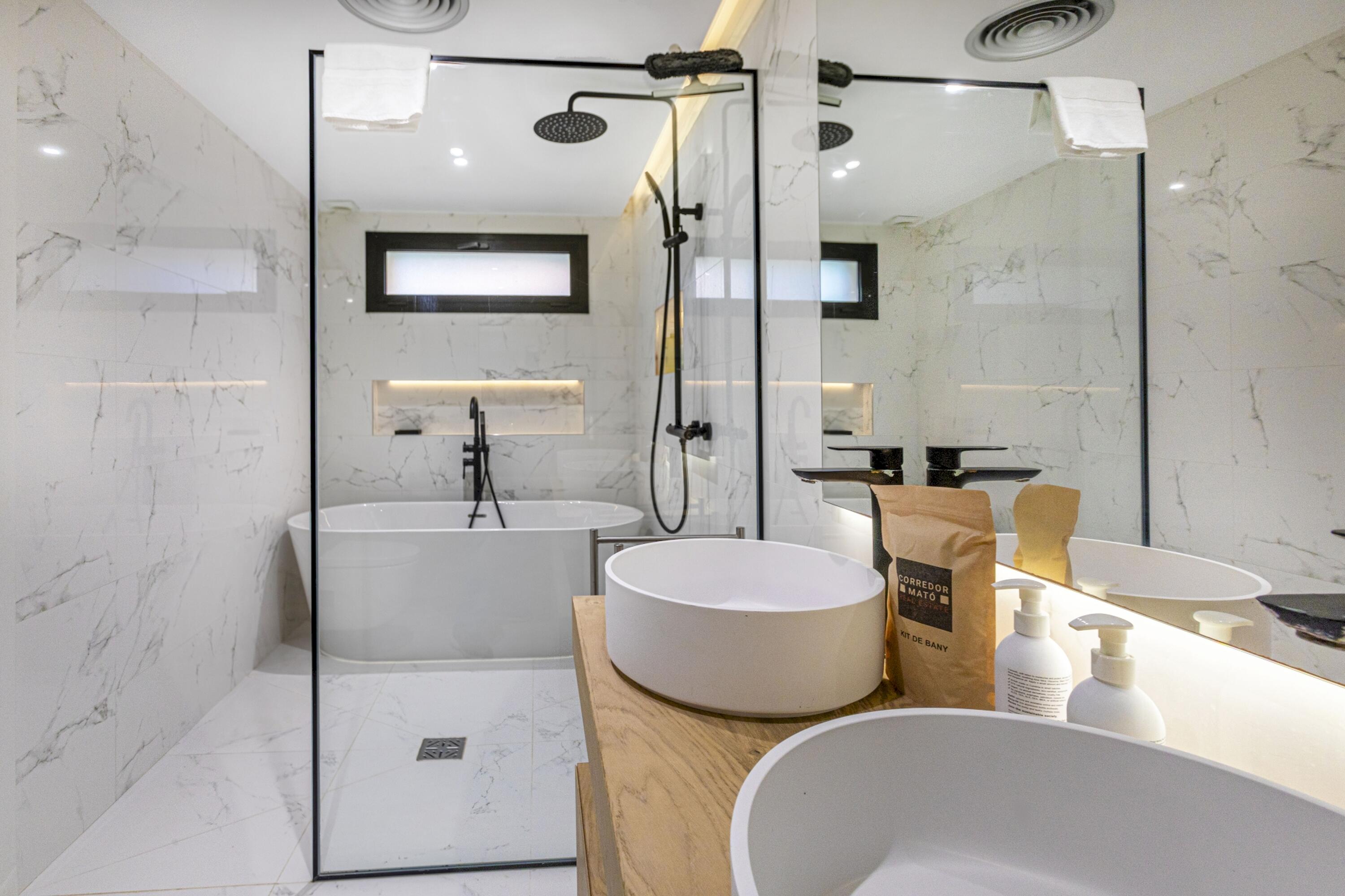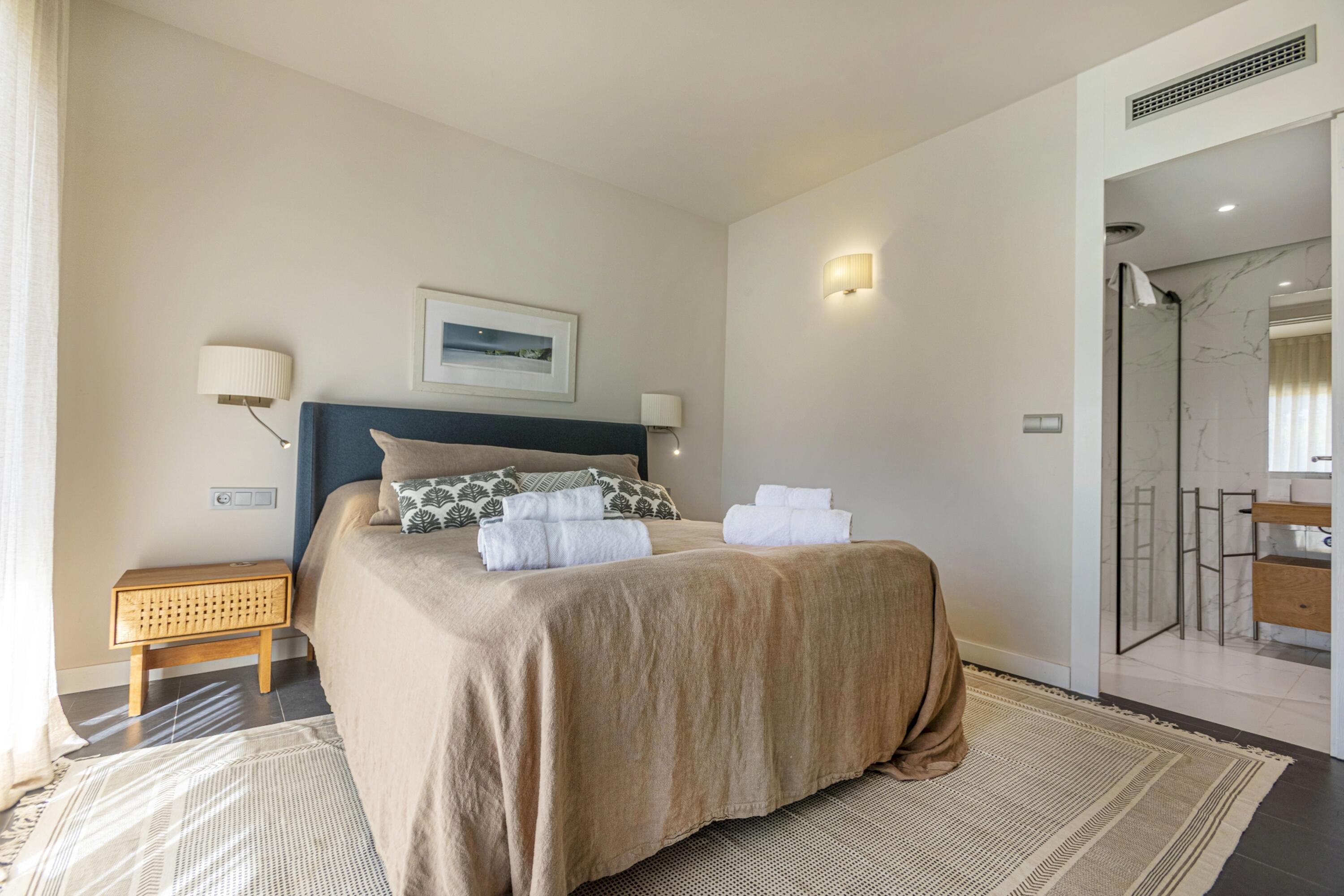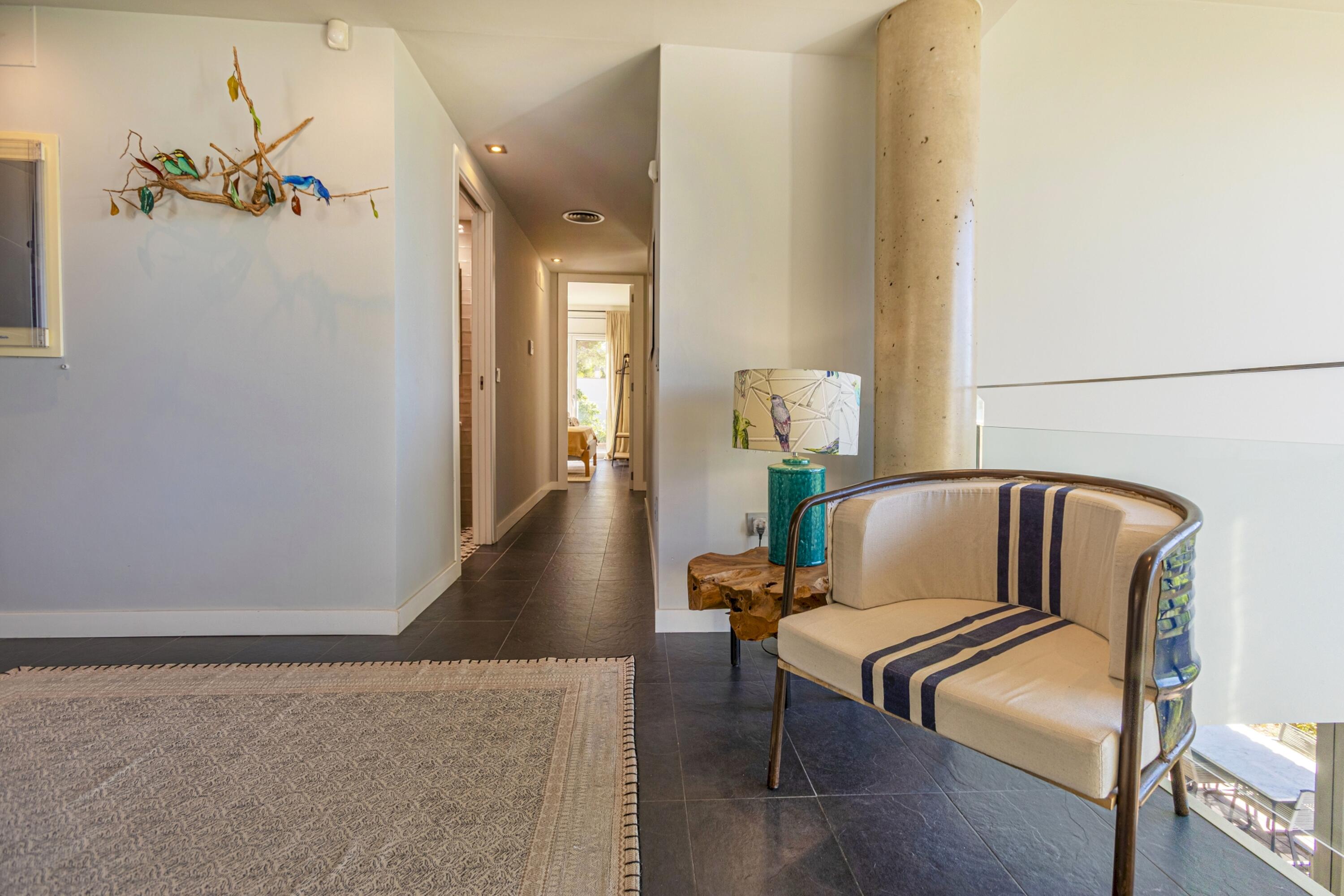 A la planta baixa es troba una gran sala d'estar, lluminosa i decorada amb molt d´estil. Aquí mateix hi ha un lavabo de cortesia i espai de menjador adjacent a la cuina oberta i moderna i totalment equipada amb illa central i aigua potable gràcies al sistema d´osmosi. Des de totes aquestes zones es pot accedir a la piscina d´aigua salada i al jardí, així com des del dormitori principal que disposa de la seva pròpia terrassa, perfecta per prendre el sol després d'un bon bany, sopar a la fresca amb els amics i la família, o simplement gaudir de les vistes de l'olivera mil·lenària i la plantació mediterrània i els turons més enllà, amb una copa de cava fresc. El dormitori principal té un vestidor independent i un impressionant bany amb efecte de marbre blanc, dutxa amb efecte de pluja, banyera i accessoris moderns de luxe.