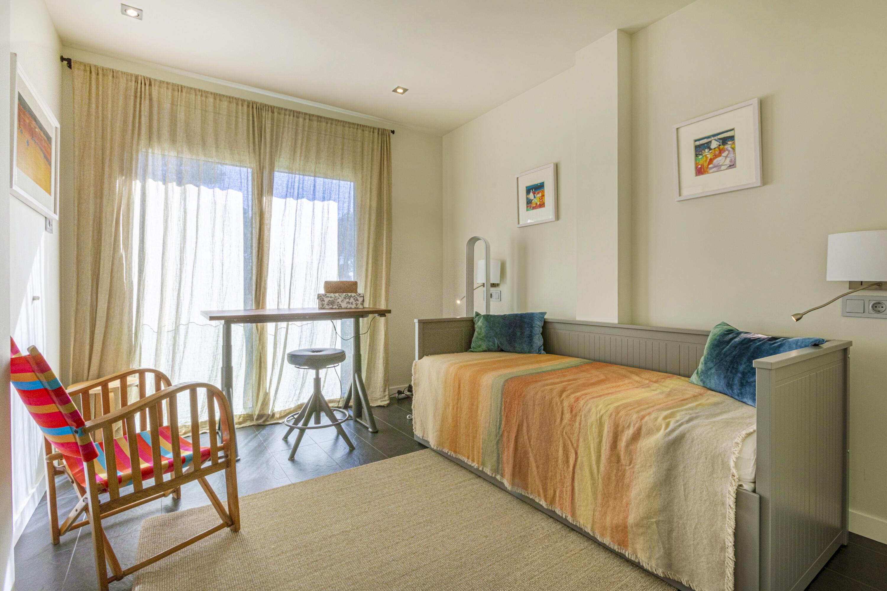 A la planta superior hi ha un gran rebedor, amb una porta a mà dreta que dóna a l'ampli garatge que també conté la rentadora i l'assecadora. A mà esquerra a la vostra disposició hi ha tres dormitoris més: un doble amb terrassa pròpia i vistes obertes a la vall, un segon dormitori doble amb propi bany i una altra habitació doble. Totes les habitacions són lluminoses i airejades. Els dos banys d'aquesta planta s'han renovat recentment en gran mesura i gaudeixen de dutxes amb efecte de pluja i d'accessoris moderns i elegants.