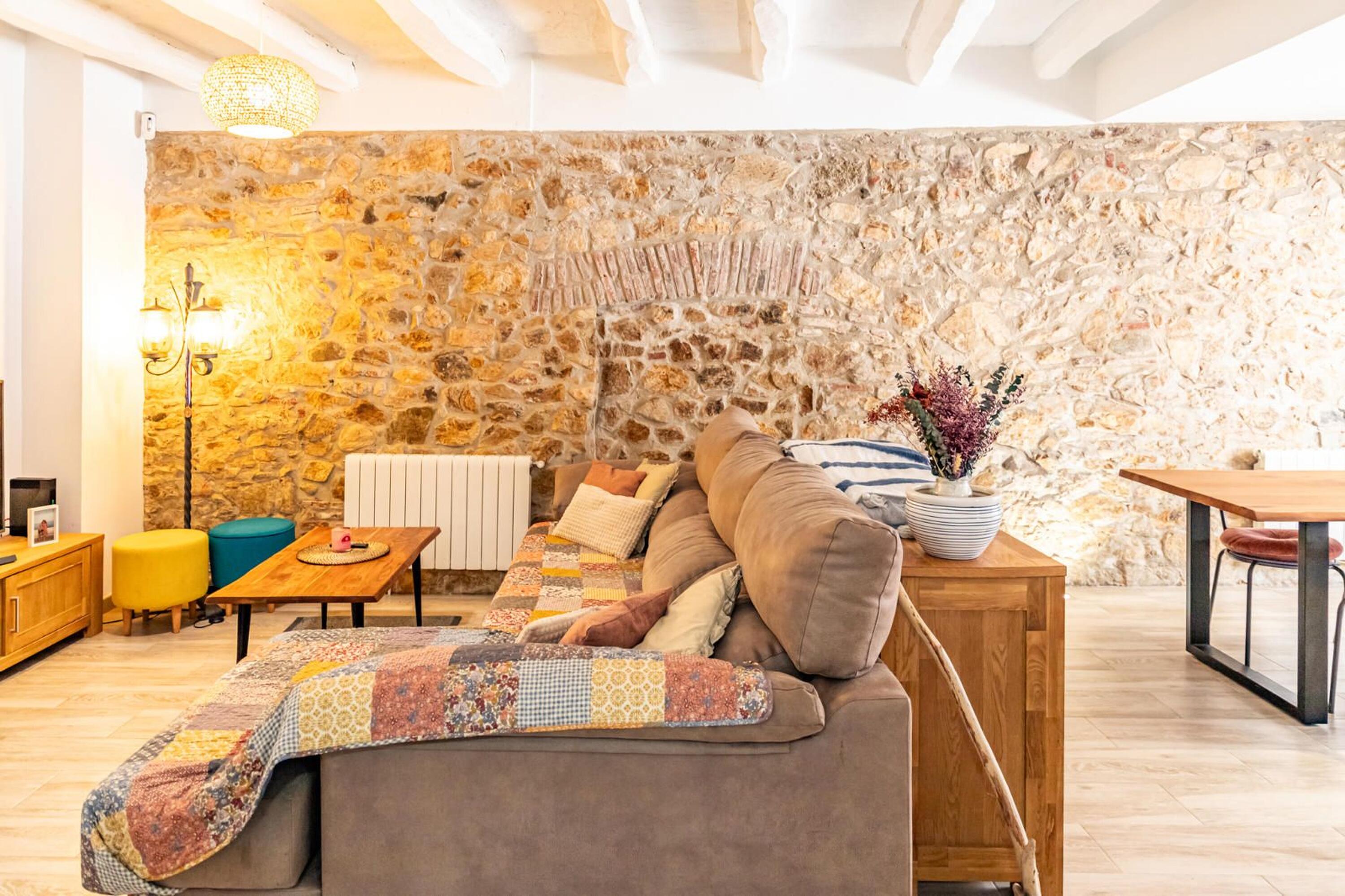 ● Spacious 31 m² living-dining room, open and inviting, with exposed stone walls and restored wooden beam ceilings.