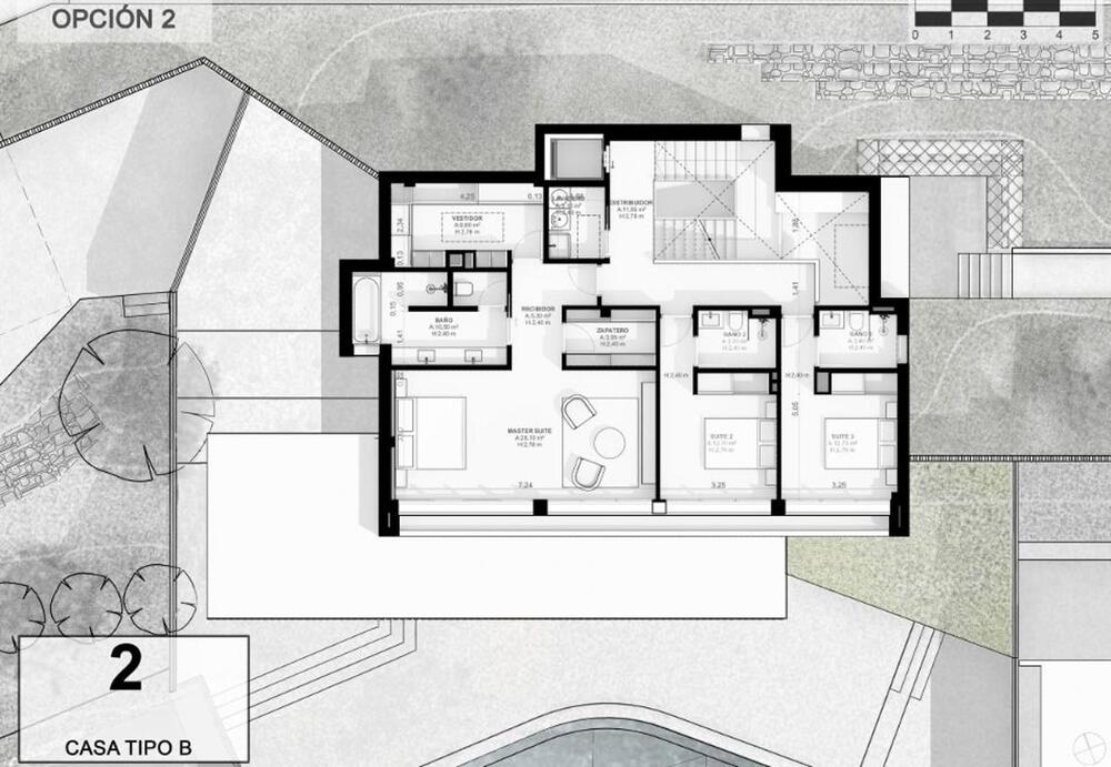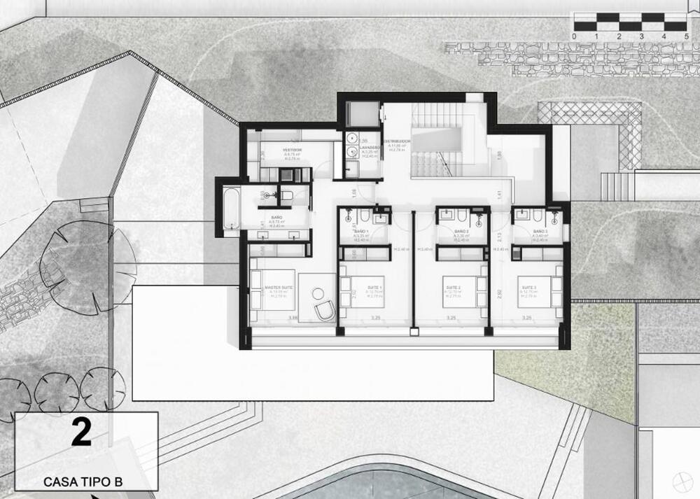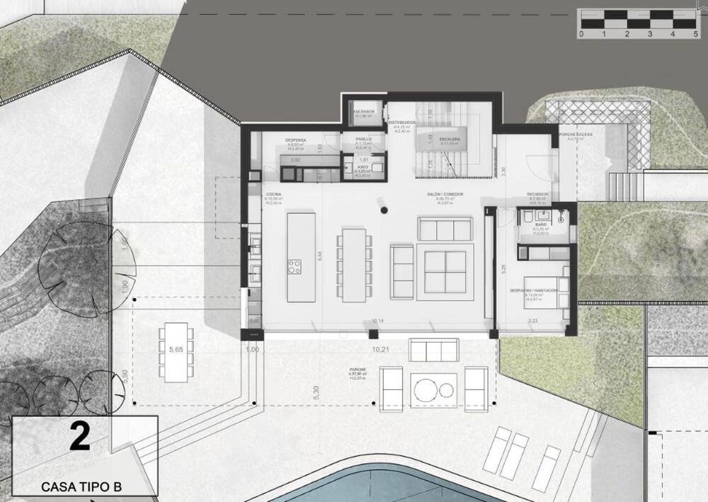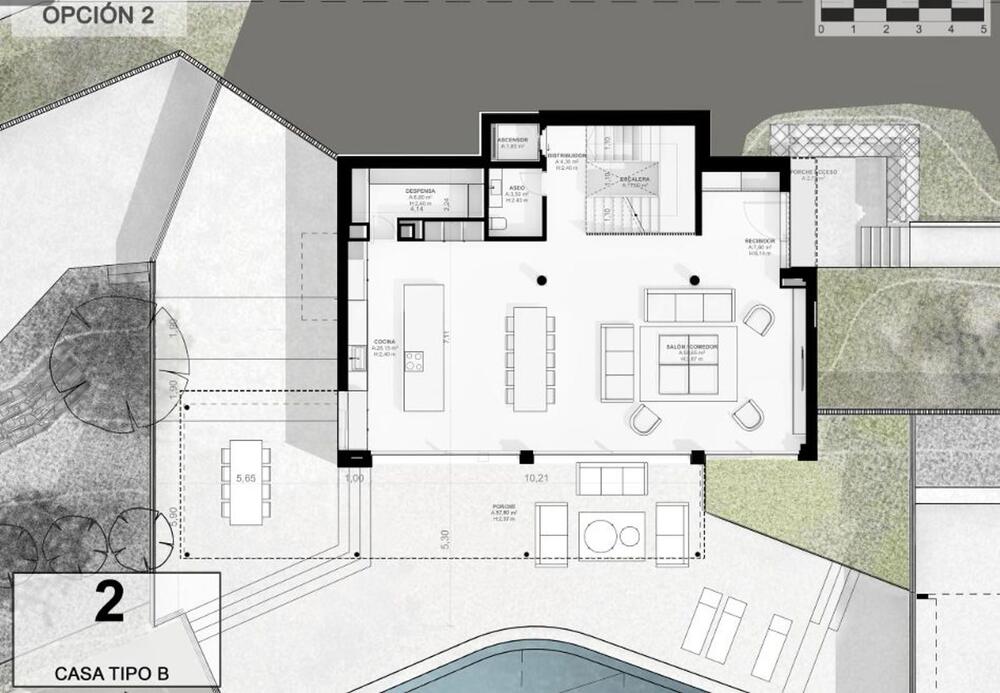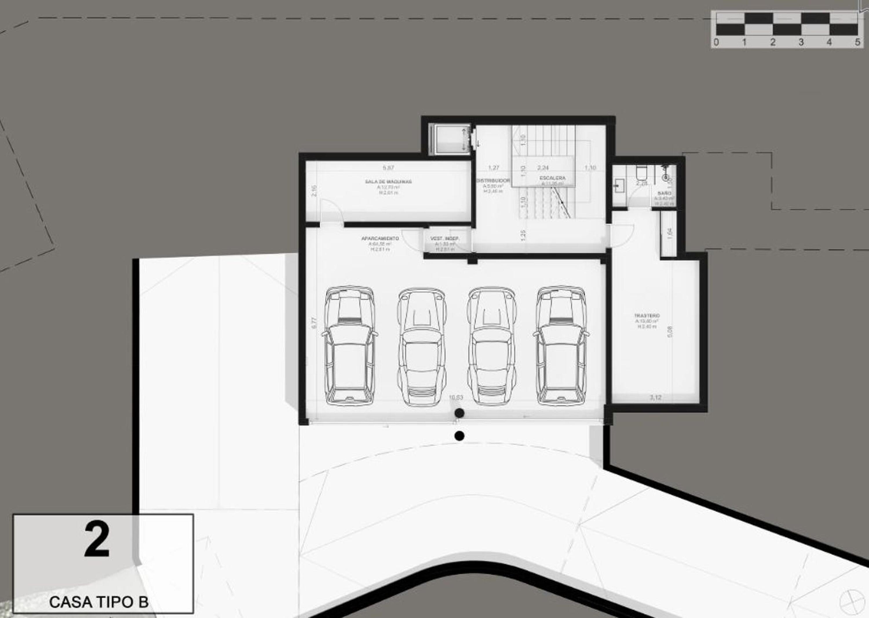 El acceso al recinto es un paseo entre árboles y vegetación mediterránea de bajo mantenimiento, que conduce a una calle subterránea con garajes privados para cuatro vehículos, combinando exclusividad y comodidad sin renunciar a la elegancia. En la planta inferior, los garajes ofrecen la posibilidad de crear un gimnasio privado, sala de ocio o espacio polivalente según tu estilo de vida.