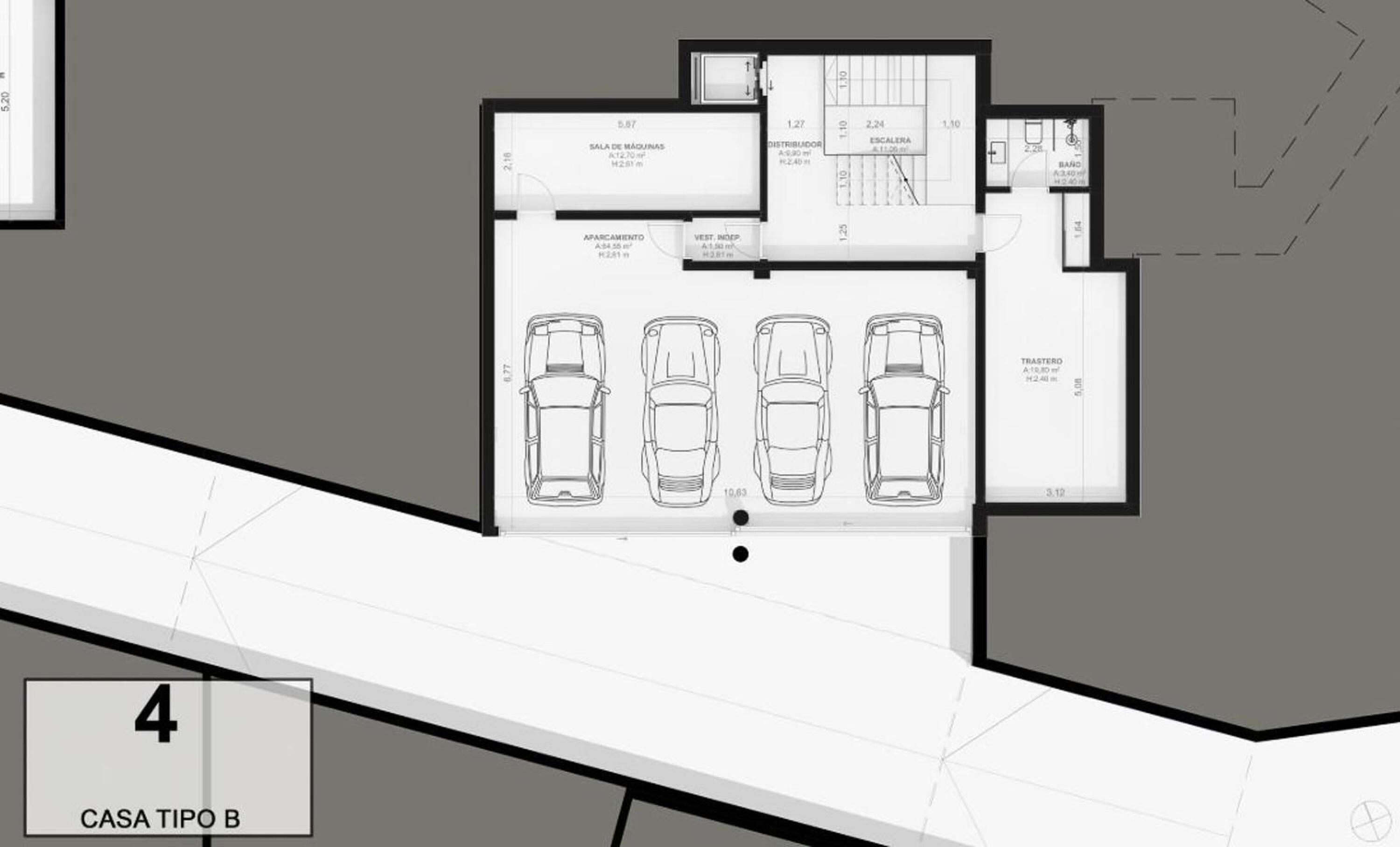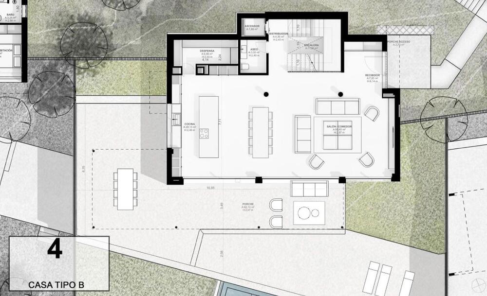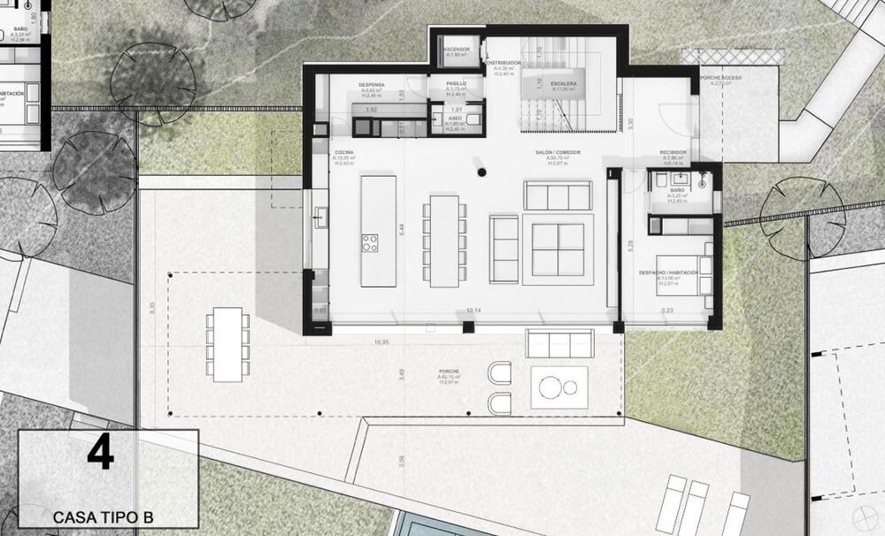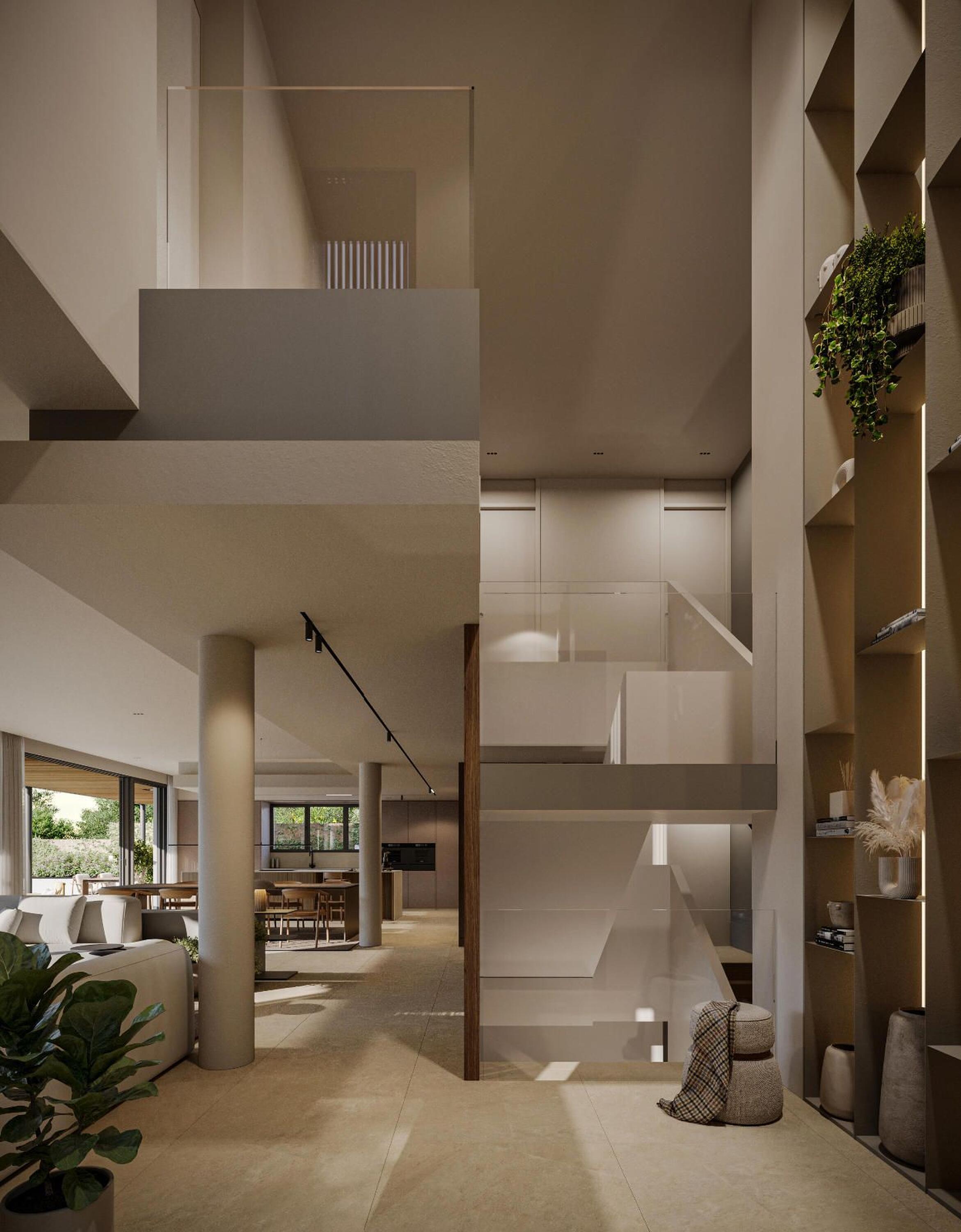 El acceso al recinto es un paseo entre árboles y vegetación mediterránea de bajo mantenimiento, que conduce a una calle subterránea con garajes privados para cuatro vehículos, combinando exclusividad y comodidad sin renunciar a la elegancia. En la planta inferior, los garajes ofrecen la posibilidad de crear un gimnasio privado, sala de ocio o espacio polivalente según tu estilo de vida.