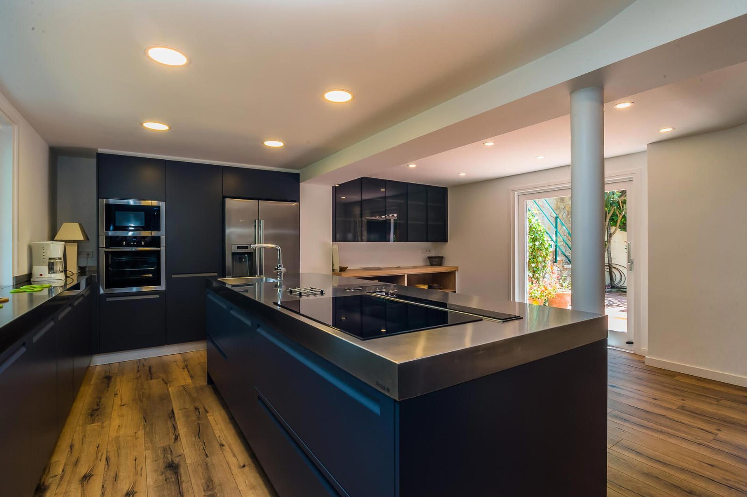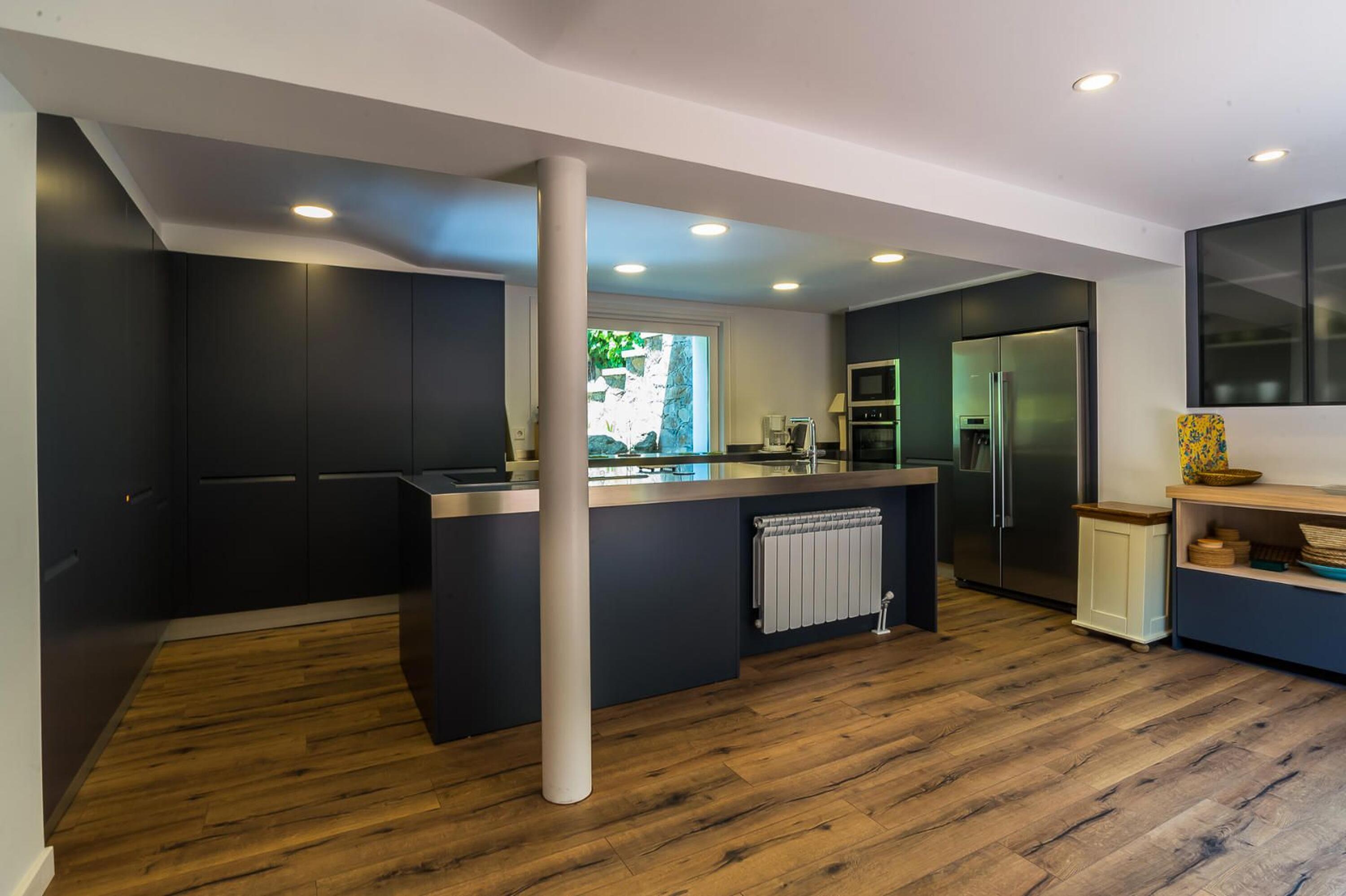 La reforma de la cocina de esta casa ha sido espectacular y muy meditada a la hora de elegir el mobiliario y los electrodomésticos, todos modernos, funcionales y de alta gama: nevera americana, campana integrada en la encimera, con zona de trabajo de acero inoxidable, diseño en el almacenaje del mobiliario, y una amplia zona de comedor para el disfrute de esta zona. Con unos amplios ventanales para recrear un ambiente natural. Salida a una bonita terraza desde la cual se accede a las escaleras que llevan a la piscina.