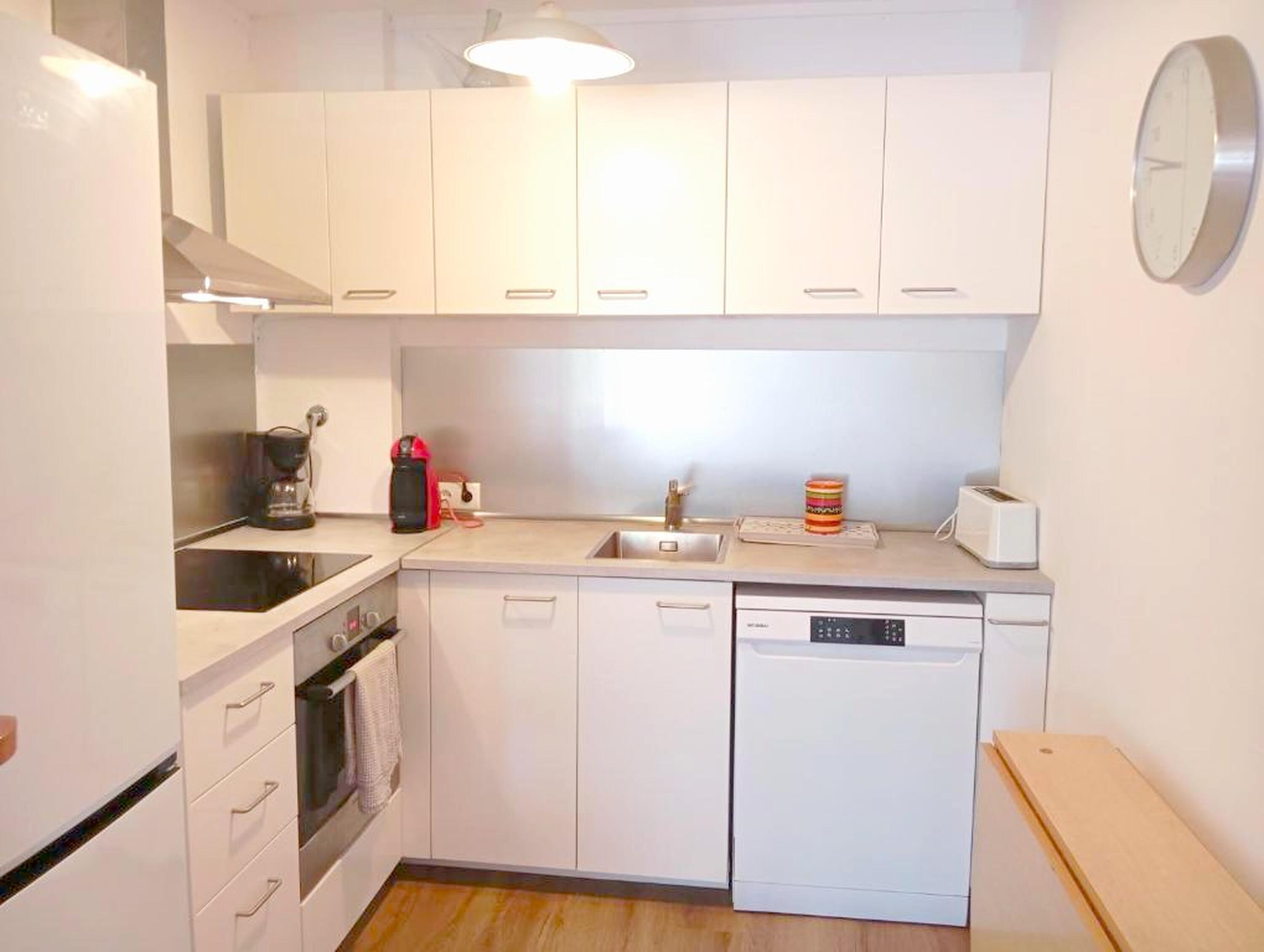 Открытая кухня полностью оборудована и включает холодильник, морозильную камеру, стеклокерамическую плиту, духовку, микроволновую печь, стиральную машину и посудомоечную машину. Всё продумано для удобного и комфортного проживания во время отпуска.